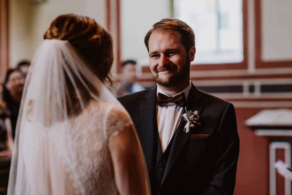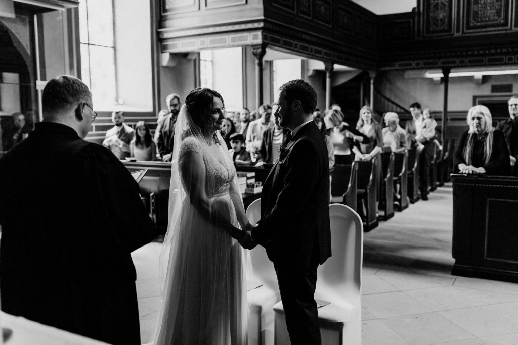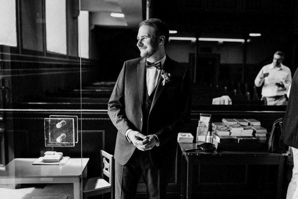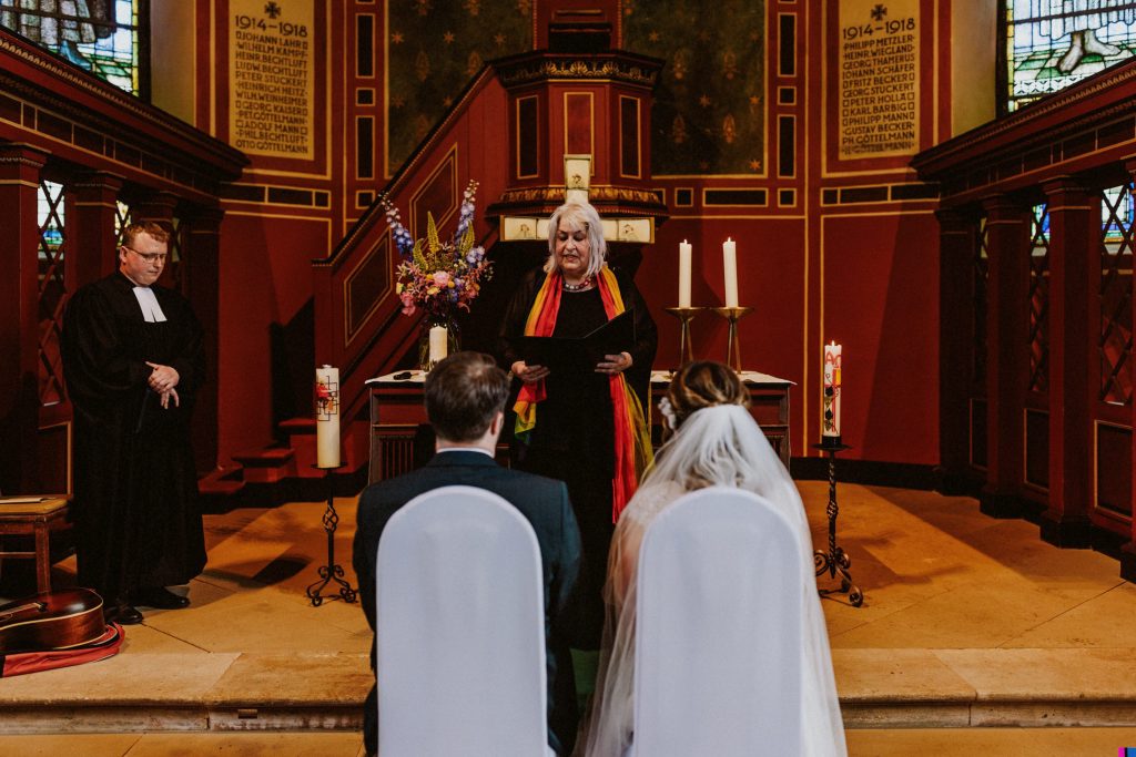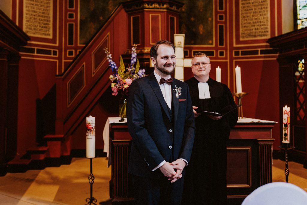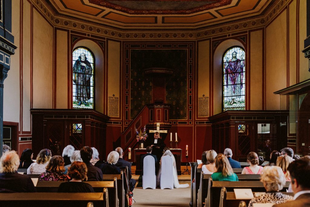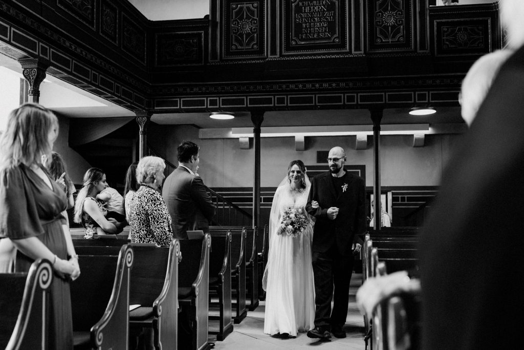 Der Saal überzeugt durch seine Dekoration und Lichtgestaltung, was ihn perfekt für stimmungsvolle Hochzeitsfotos macht. Ein Bild vor der charakteristischen blauen Eingangstür ist dabei fast schon ein Muss!