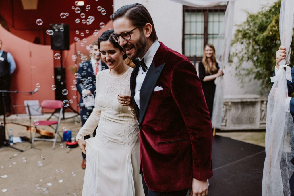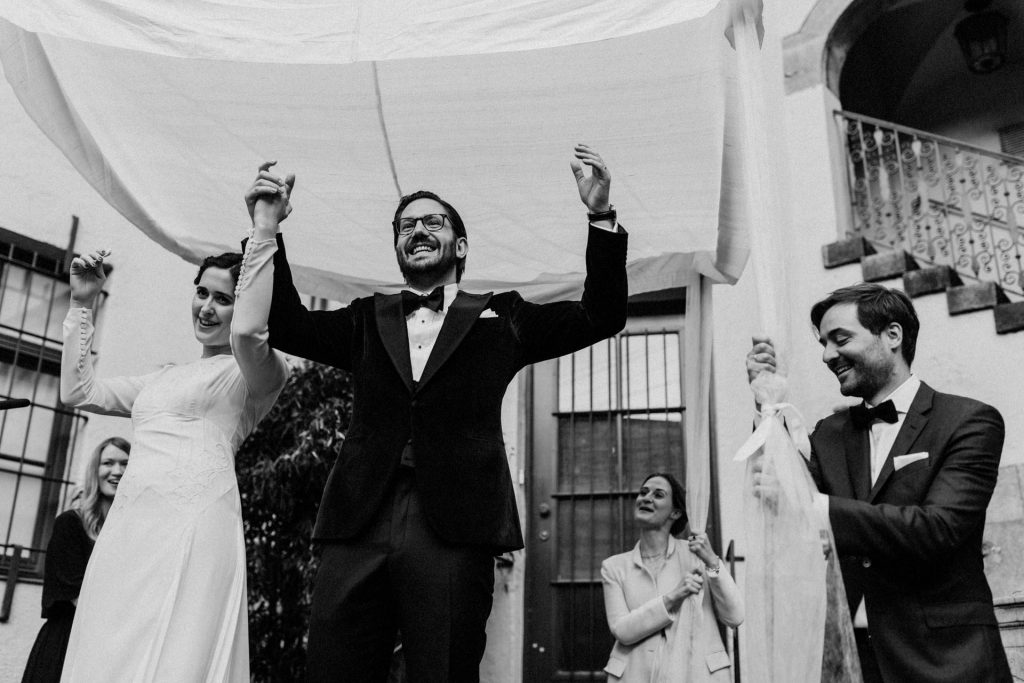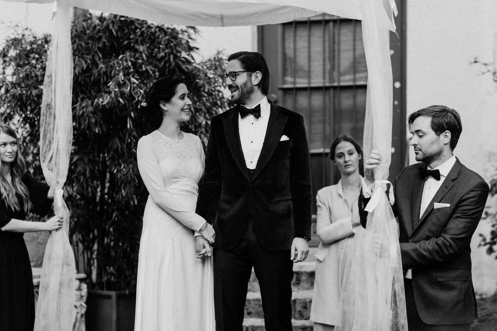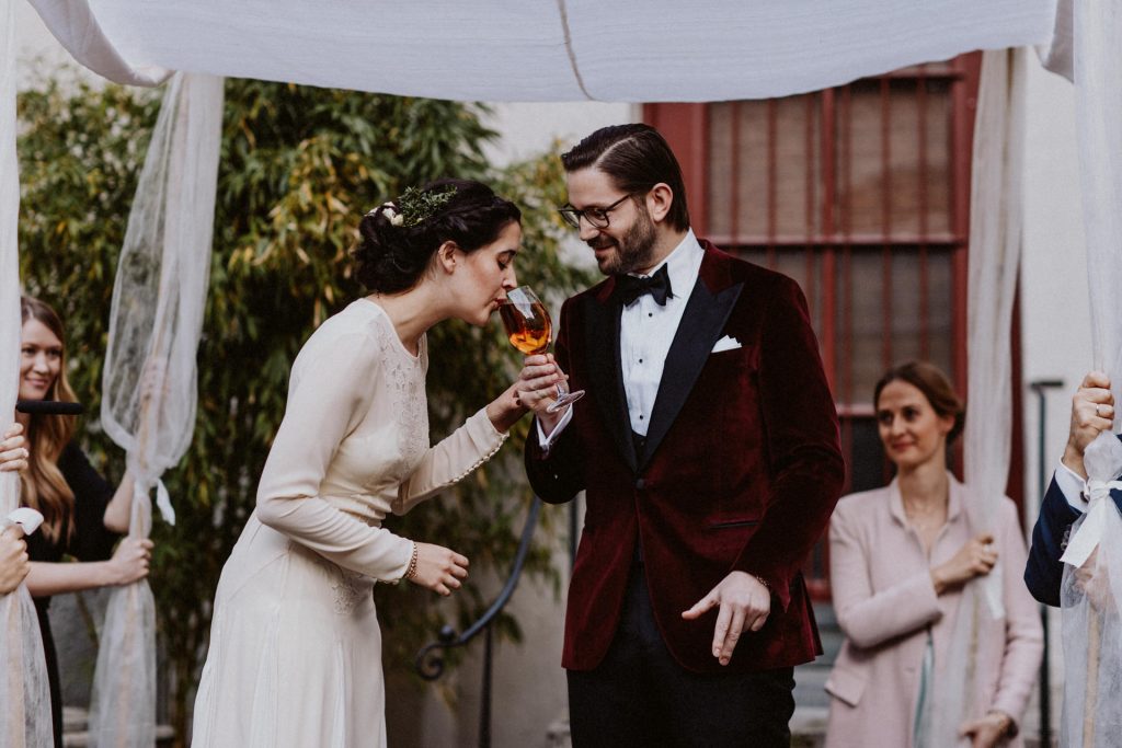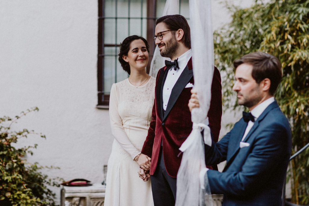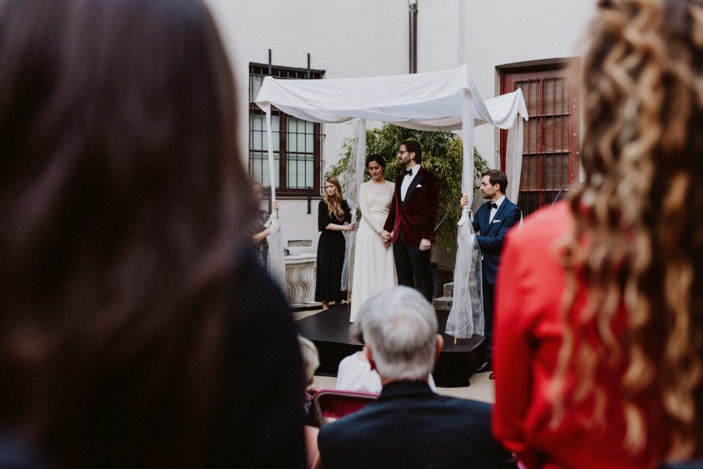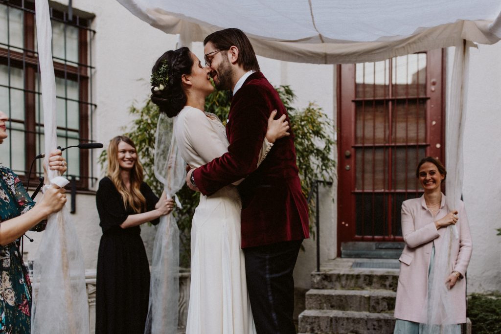 Die Trauung fand im Innenhof unter freiem Himmel statt. Trotz der zentralen Lage in München ist man im Künstlerhaus abgeschieden und kann sehr privat Hochzeit feiern. Für mich ist es immer wieder faszinierend, Hochzeitsbräuche anderer Kulturen kennenzulernen – so wie hier die Mischung aus deutschen und jüdischen Traditionen. Besonders schön war es auch, dass der Bruder der Braut die Zeremonie geleitet hat und die Ansprache der deutsch-jüdischen Hochzeit sowohl auf Hebräisch als auch auf Deutsch halten konnte. Vier Freunde des Brautpaares hielten den Traubaldachin, die Chuppa, gemeinsam fest unter welchem das Paar während der Zeremonie stand. Als Abschluss folgte das traditionelle Zertreten eines in Tuch eingewickelten Glases des Bräutigams.