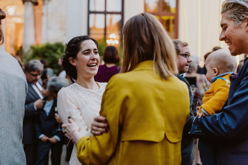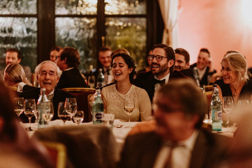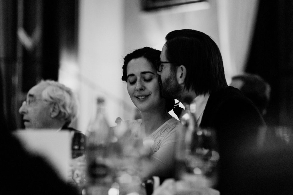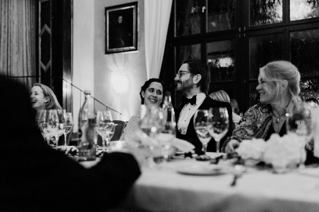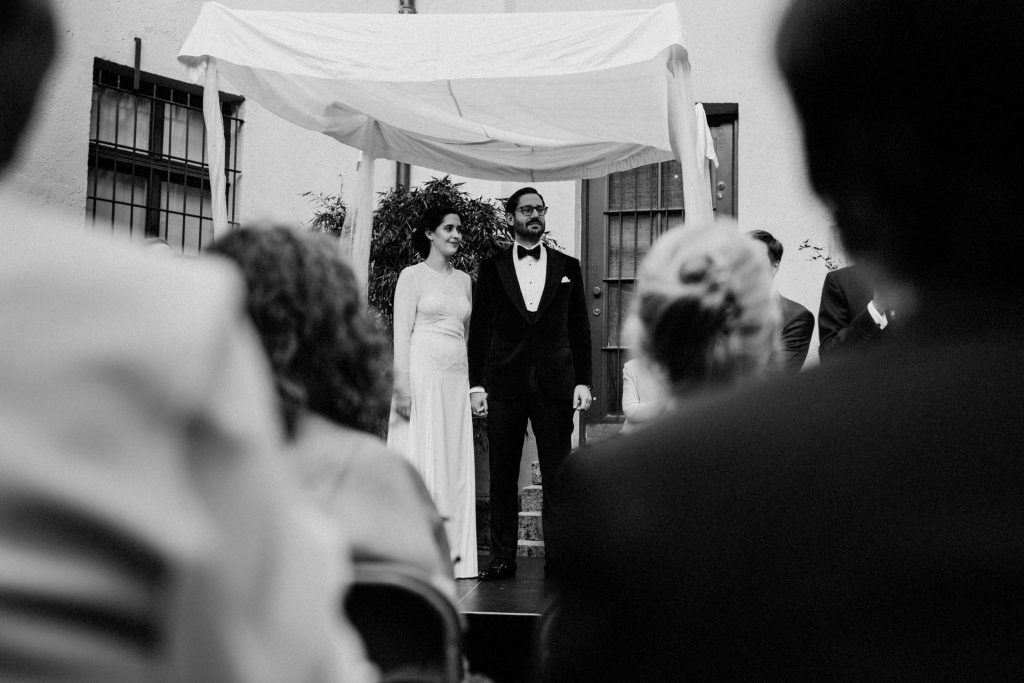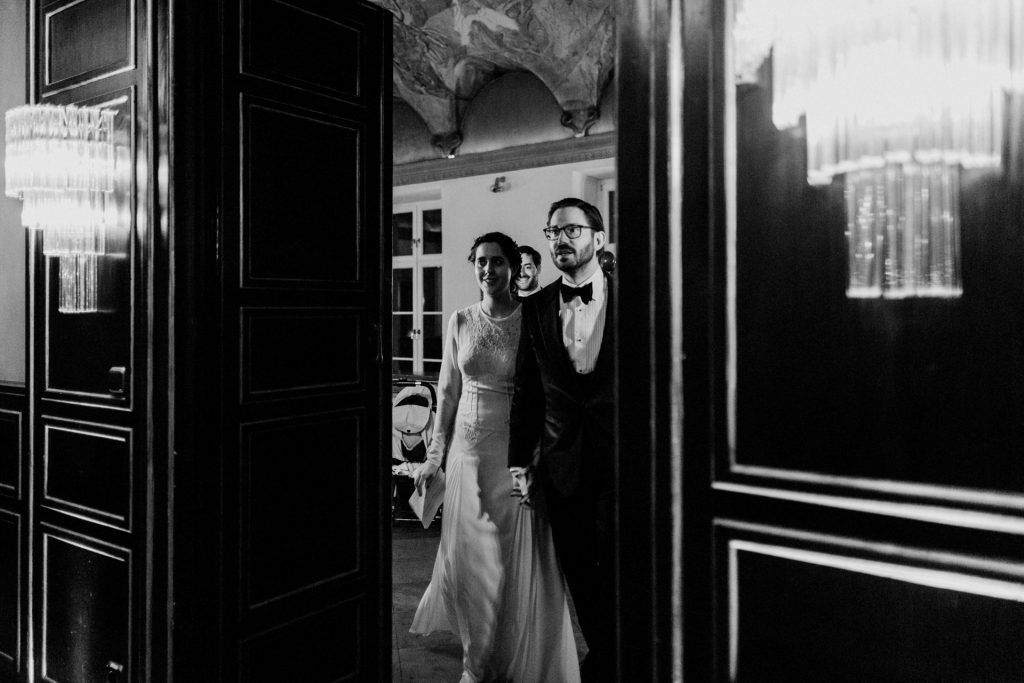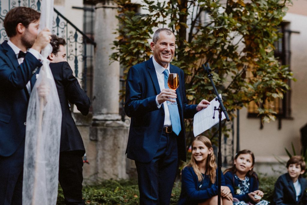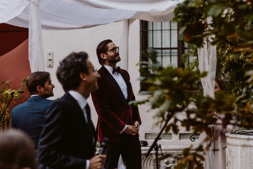 Die Trauung fand im Innenhof unter freiem Himmel statt. Trotz der zentralen Lage in München ist man im Künstlerhaus abgeschieden und kann sehr privat Hochzeit feiern. Für mich ist es immer wieder faszinierend, Hochzeitsbräuche anderer Kulturen kennenzulernen – so wie hier die Mischung aus deutschen und jüdischen Traditionen. Besonders schön war es auch, dass der Bruder der Braut die Zeremonie geleitet hat und die Ansprache der deutsch-jüdischen Hochzeit sowohl auf Hebräisch als auch auf Deutsch halten konnte. Vier Freunde des Brautpaares hielten den Traubaldachin, die Chuppa, gemeinsam fest unter welchem das Paar während der Zeremonie stand. Als Abschluss folgte das traditionelle Zertreten eines in Tuch eingewickelten Glases des Bräutigams.