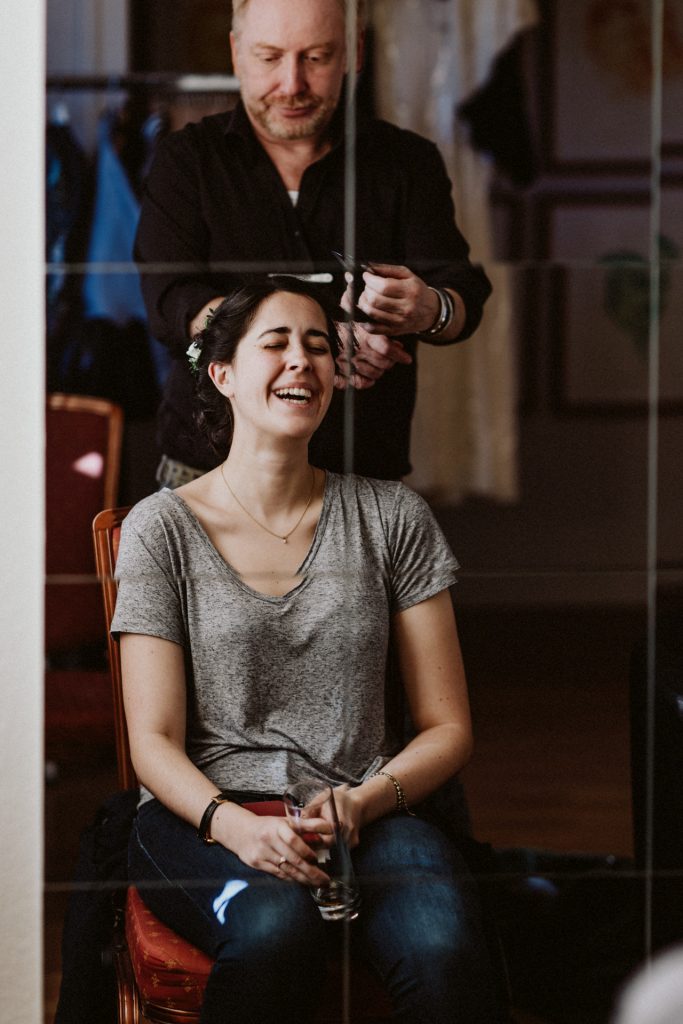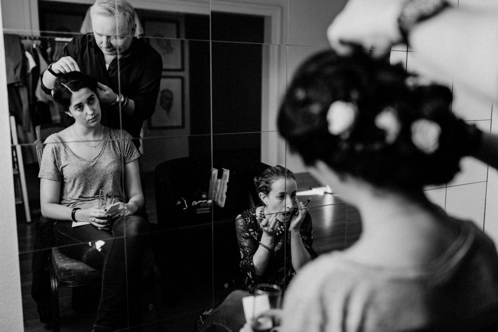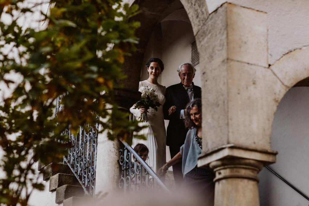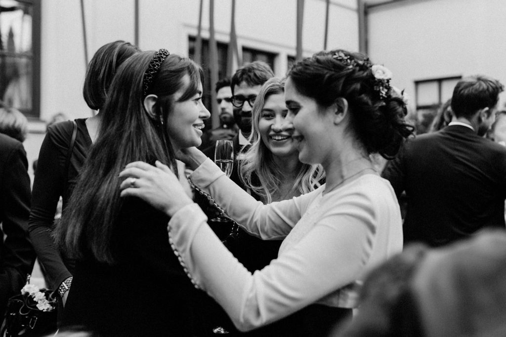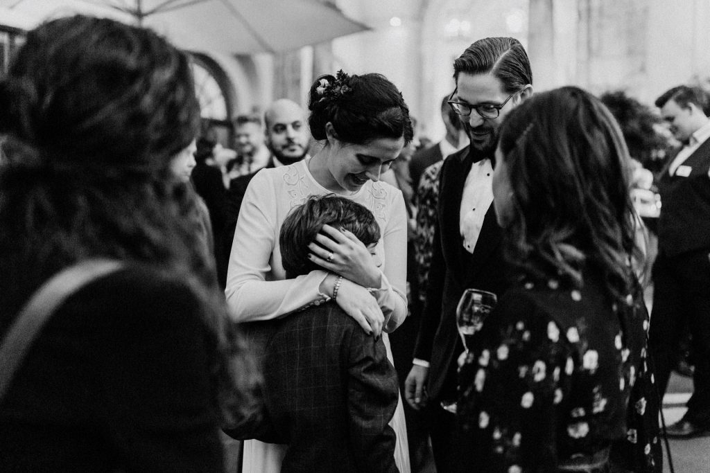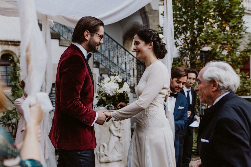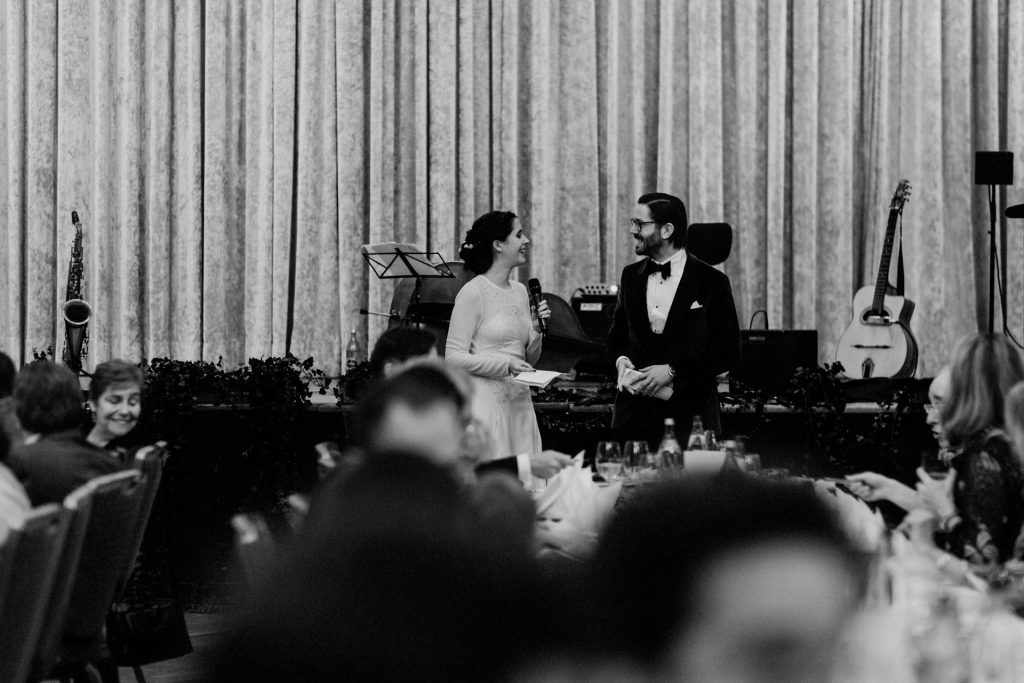Die Trauung fand im Innenhof unter freiem Himmel statt. Trotz der zentralen Lage in München ist man im Künstlerhaus abgeschieden und kann sehr privat Hochzeit feiern. Für mich ist es immer wieder faszinierend, Hochzeitsbräuche anderer Kulturen kennenzulernen – so wie hier die Mischung aus deutschen und jüdischen Traditionen. Besonders schön war es auch, dass der Bruder der Braut die Zeremonie geleitet hat und die Ansprache der deutsch-jüdischen Hochzeit sowohl auf Hebräisch als auch auf Deutsch halten konnte. Vier Freunde des Brautpaares hielten den Traubaldachin, die Chuppa, gemeinsam fest unter welchem das Paar während der Zeremonie stand. Als Abschluss folgte das traditionelle Zertreten eines in Tuch eingewickelten Glases des Bräutigams.