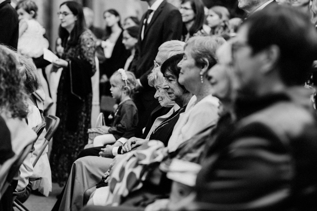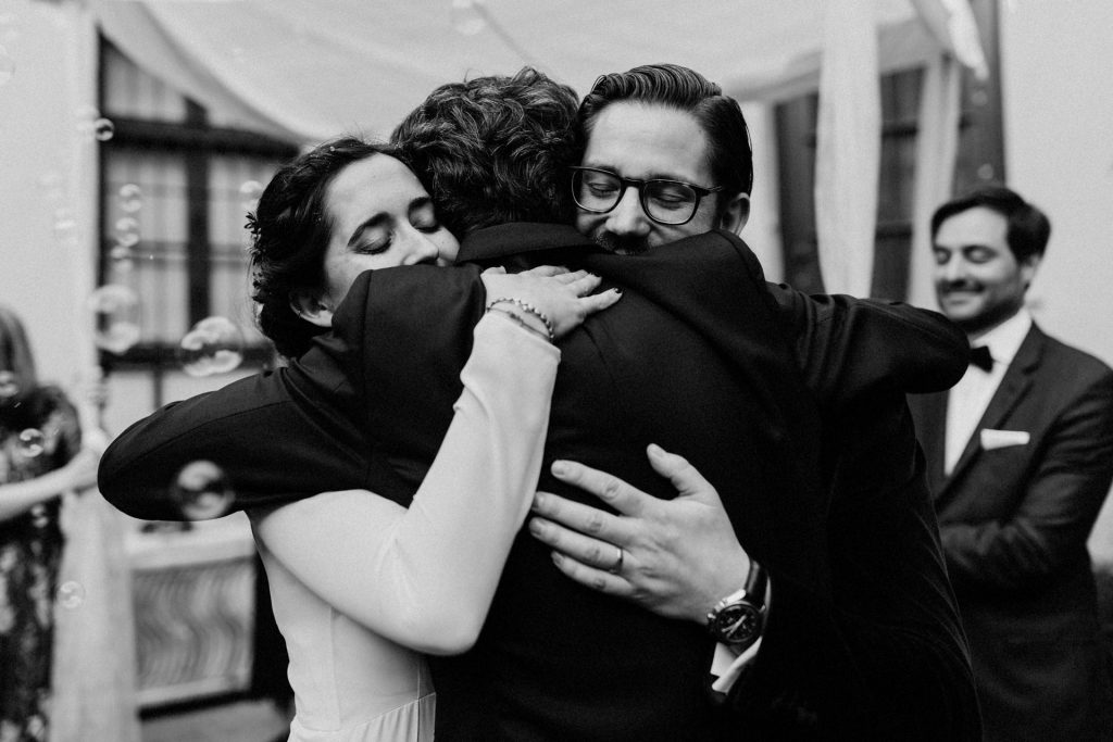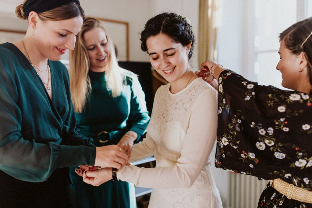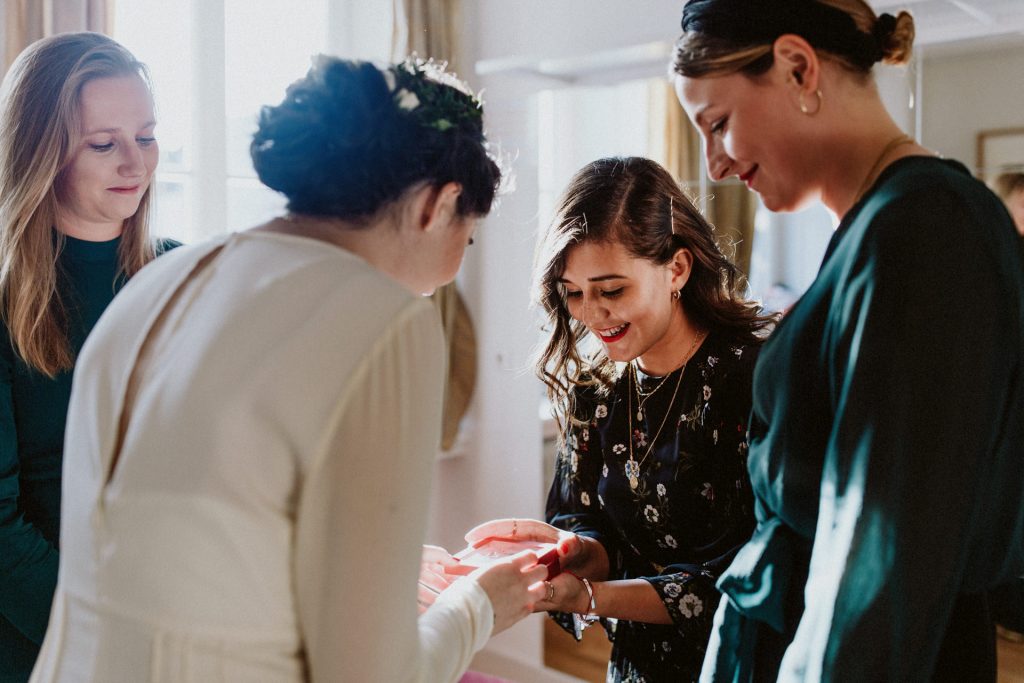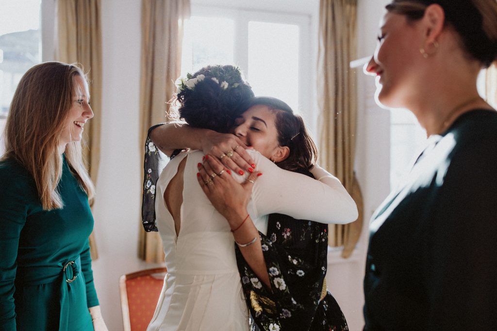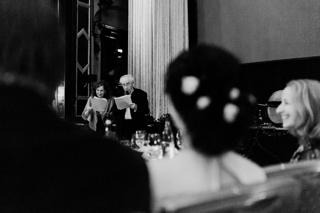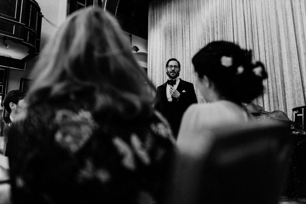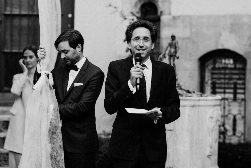 Die Trauung fand im Innenhof unter freiem Himmel statt. Trotz der zentralen Lage in München ist man im Künstlerhaus abgeschieden und kann sehr privat Hochzeit feiern. Für mich ist es immer wieder faszinierend, Hochzeitsbräuche anderer Kulturen kennenzulernen – so wie hier die Mischung aus deutschen und jüdischen Traditionen. Besonders schön war es auch, dass der Bruder der Braut die Zeremonie geleitet hat und die Ansprache der deutsch-jüdischen Hochzeit sowohl auf Hebräisch als auch auf Deutsch halten konnte. Vier Freunde des Brautpaares hielten den Traubaldachin, die Chuppa, gemeinsam fest unter welchem das Paar während der Zeremonie stand. Als Abschluss folgte das traditionelle Zertreten eines in Tuch eingewickelten Glases des Bräutigams.