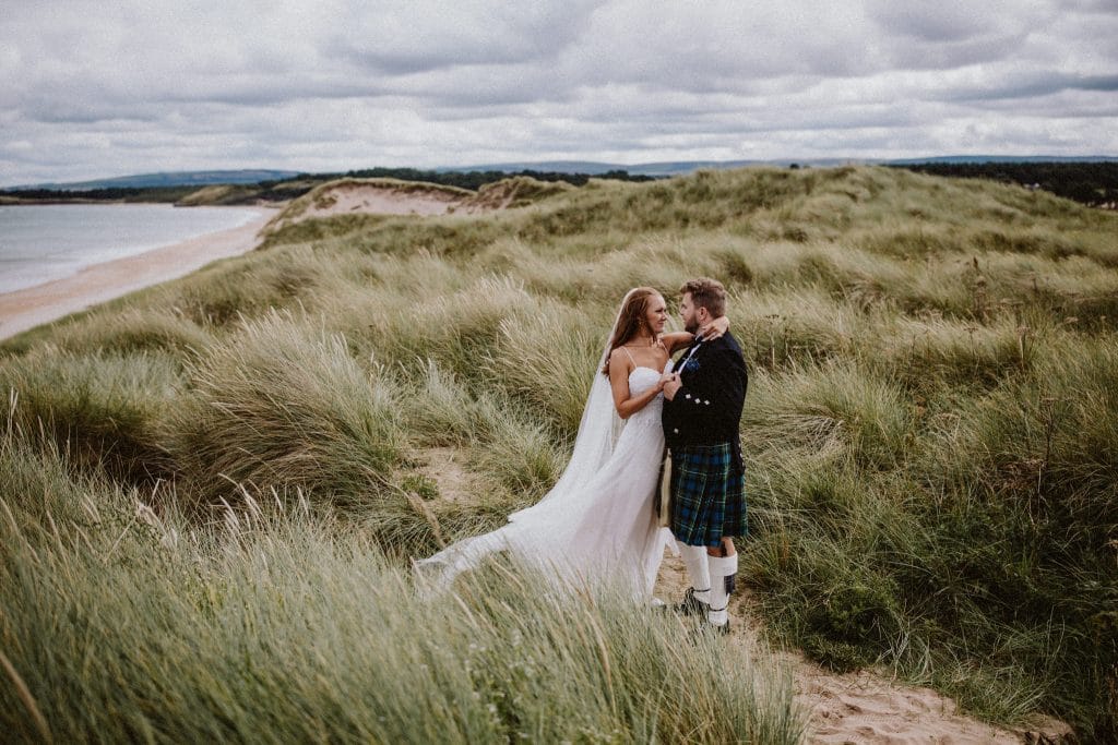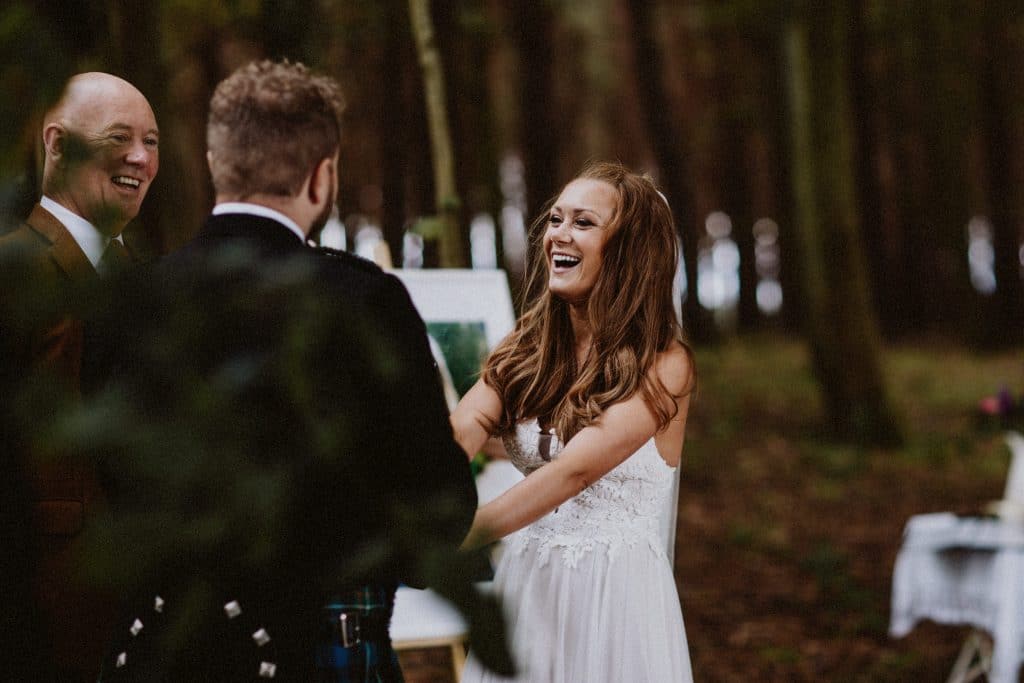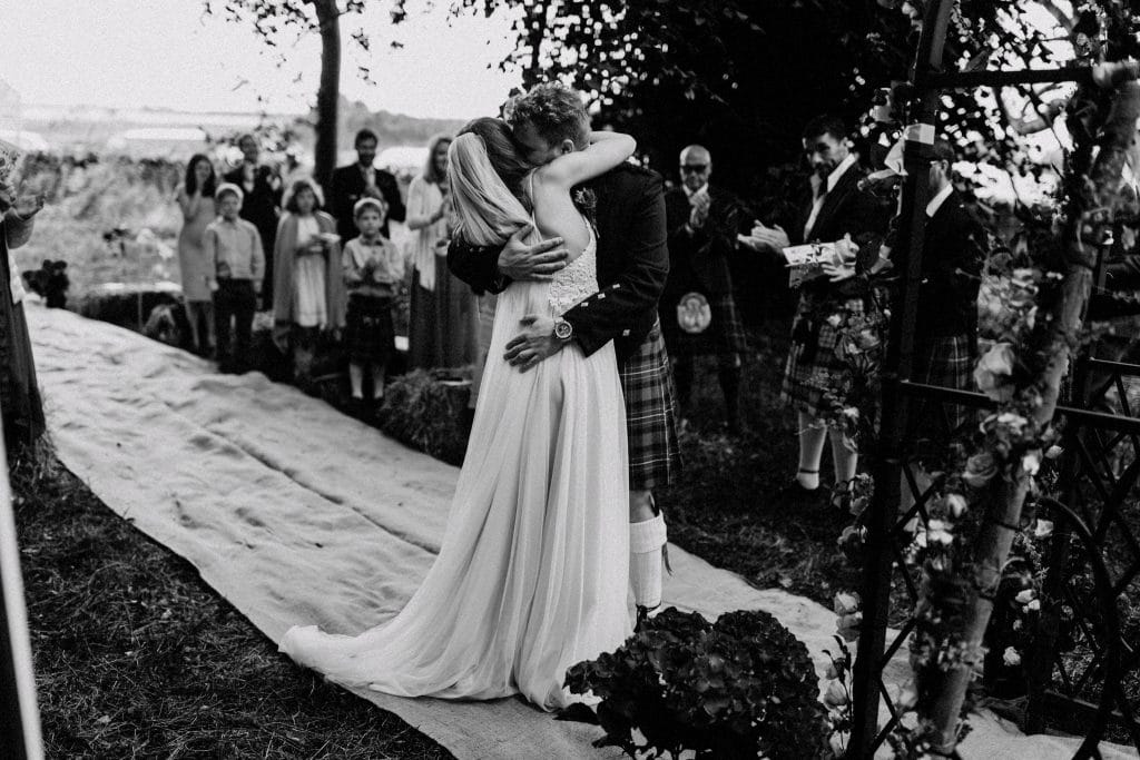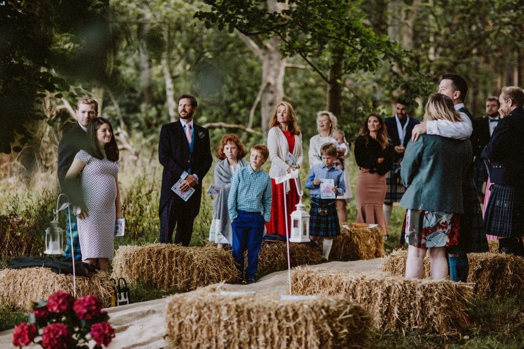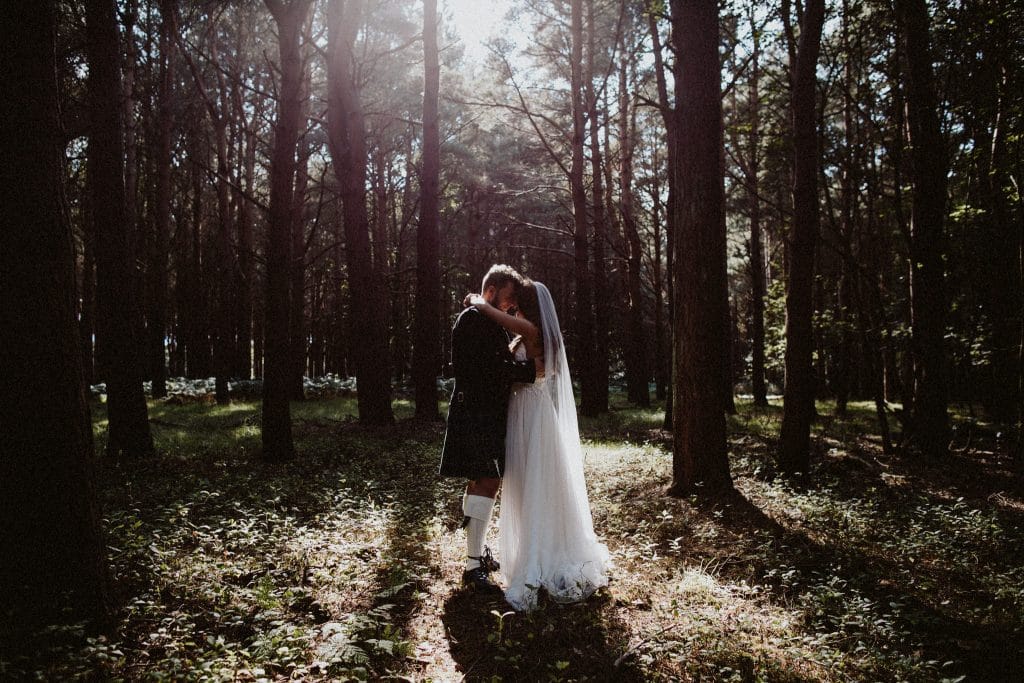 Im Arm ihres Vaters macht sich die Braut schließlich auf den Weg zu ihrem Zukünftigen. Der Ort, an dem die beiden heute verheiratet werden, ist wie aus einem Märchen entsprungen. Harvest Moon Weddings in Dunbar befindet sich ca. 30 km östlich von Edinburgh und bietet eine wundervolle Kulisse zum Heiraten zwischen Dünen, Strand und altem Wald. Mitten im Wald ist ein Teppich für Jenna ausgelegt, der sie zu Graeme führt. Zwischen hohen Bäumen steht ein Blumenbogen, unter dem der Bräutigam wartet. Links und rechts des Ganges sitzen die Hochzeitsgäste auf Heuballen und warten gespannt auf die Frau der Stunde. Riesige dunkelgrüne Blätter wachsen am Fuße der Pinien. Das Knistern zwischen Jenna und Graeme scheint den Wald zu füllen als sie sich lachend tief in die Augen blicken.