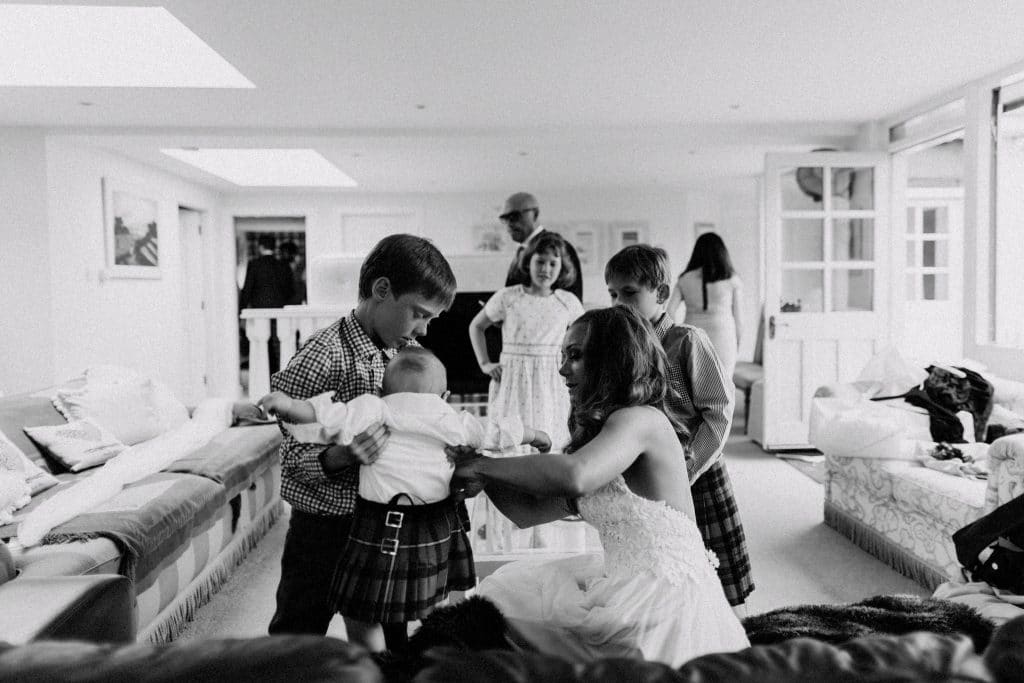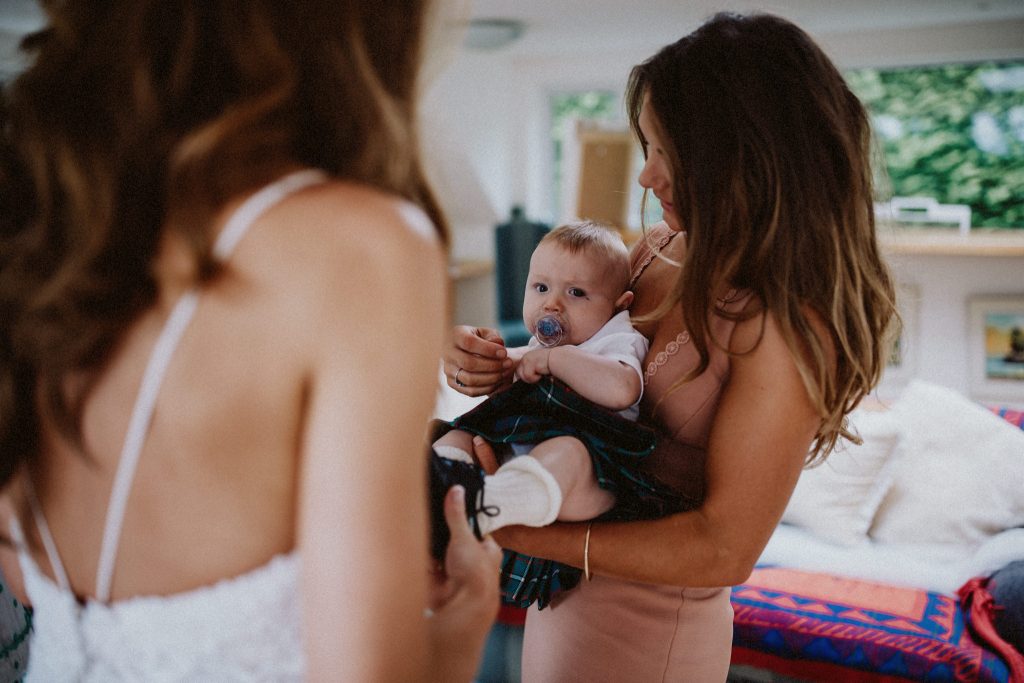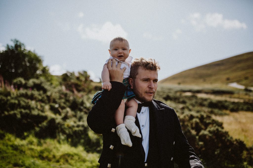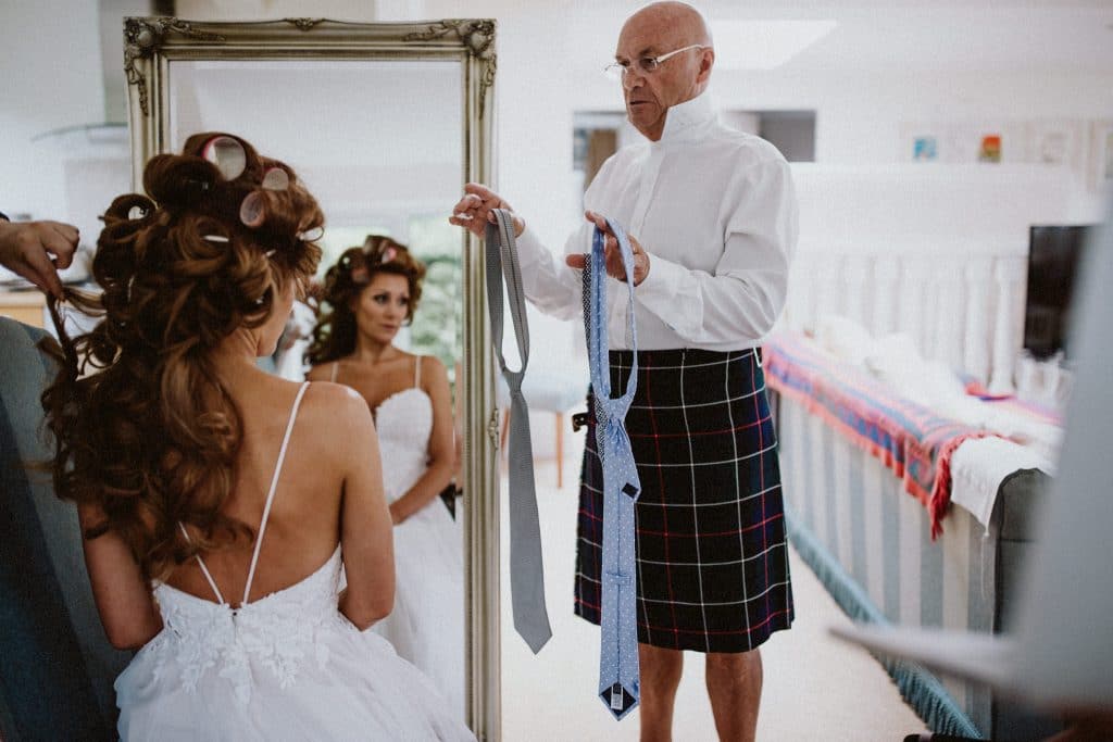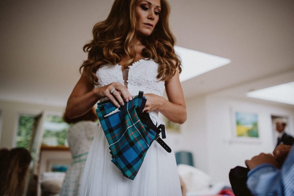 Ich begleitete Jenna bereits beim Getting Ready im Elternhaus. In ganz vertrauter Atmosphäre bereitete sie sich – umringt von den ihr nahestehenden und jüngsten Familienmitgliedern – auf den besonderen Tag vor. Schon jetzt wird klar: Schottland ist nicht nur der Ort, wo heute „Ja“ gesagt wird, er wird auch im Herzen und am Körper getragen. Die Männer schlüpfen ganz traditionell in ihre Schottenröcke und Kniestrümpfe. Sogar das Baby von Jenna und Graeme trägt kariert.